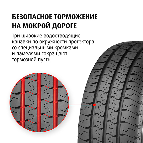 - Твёрдость блоков протектора и их плотное расположение: Высокая курсовая устойчивость при движении легко-грузовых автомобилей.